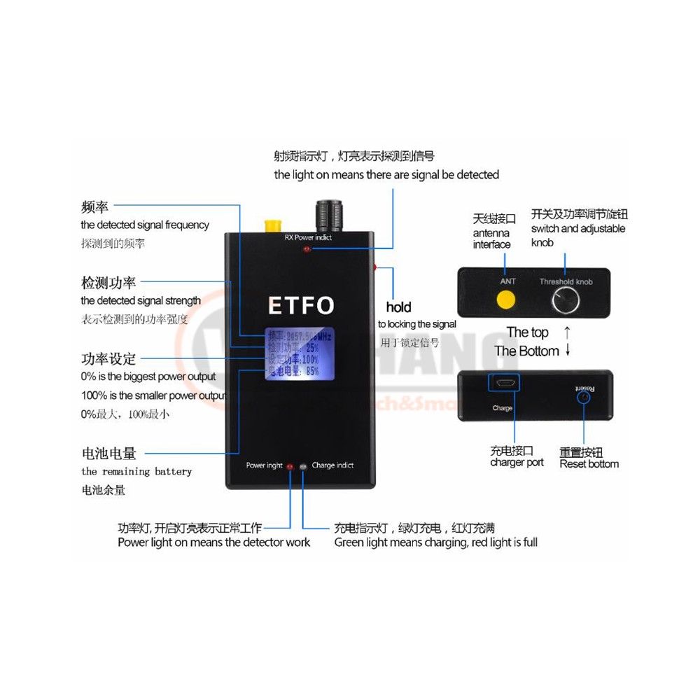 فرکانس یاب یا شمارنده امواج مدل ETFO برای شناسایی و تعیین موقعیت تجهیزات جاسوسی بیسیم و یا تلفن همراه طراحی شده است. محدوده وسیع عملکرد دستگاه به مصرف کننده امکان شناسایی ردیابی و تعیین موقعیت میکروفن های مخفی بیسیم, تجهیزات شنود ,دوربینهای مخفی بیسیم , امواج تلفن همراه و غیره را می دهد.علاوه بر آن این دستگاه جهت ردیابی وشناسایی دوربینهای تصویر برداری وایرلس نیز طراحی شده است.